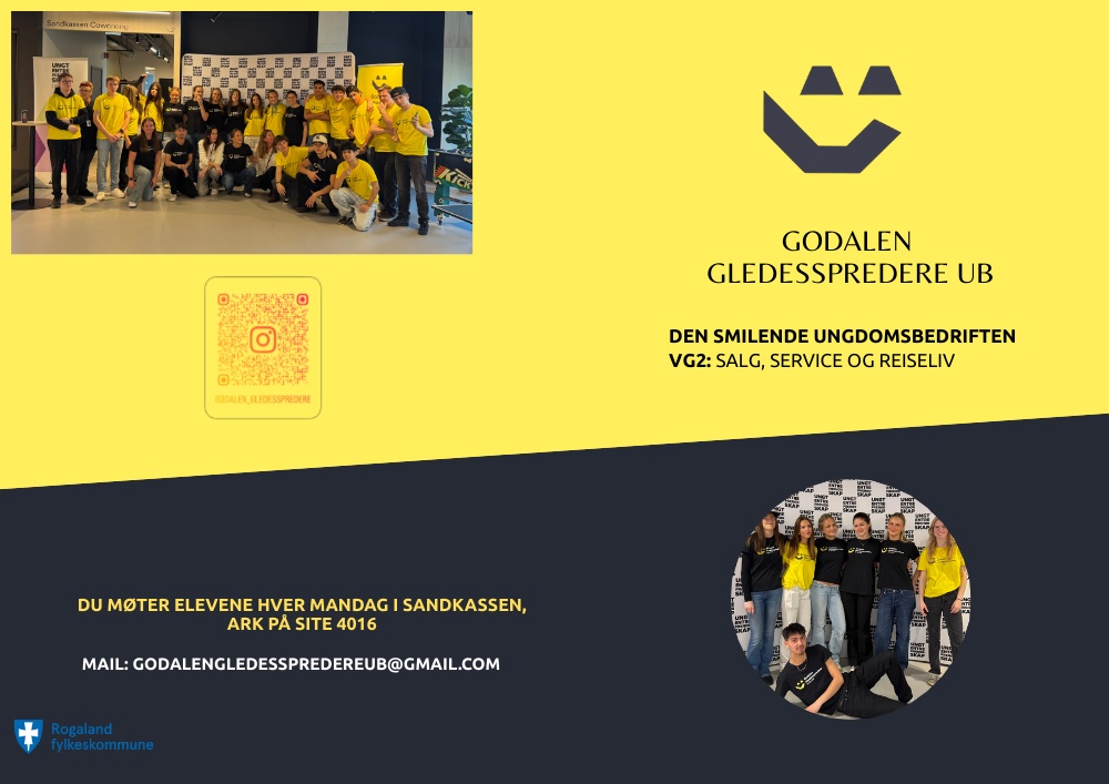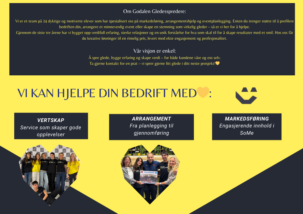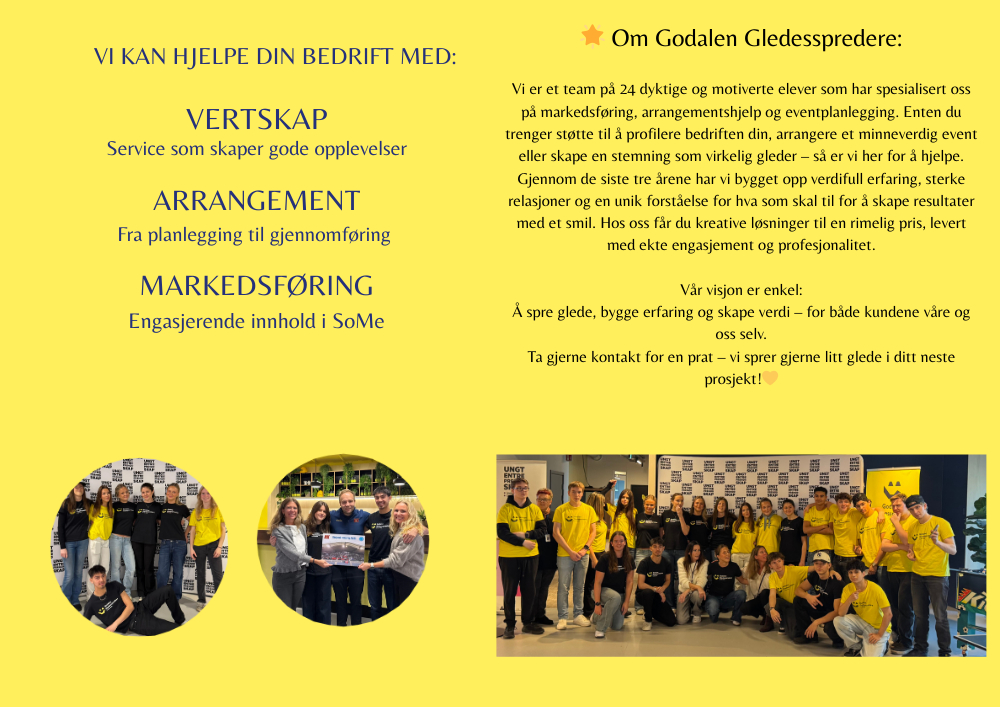 Vi er et engasjert team av VG2-elever innen salg, service og reiseliv, som jobber praktisk med vertskap, arrangement og markedsføring. Hos oss handler det om å skape gode opplevelser, spre glede og levere med ekte innsats – enten det er i møte med mennesker, på et arrangement eller i digitale flater.